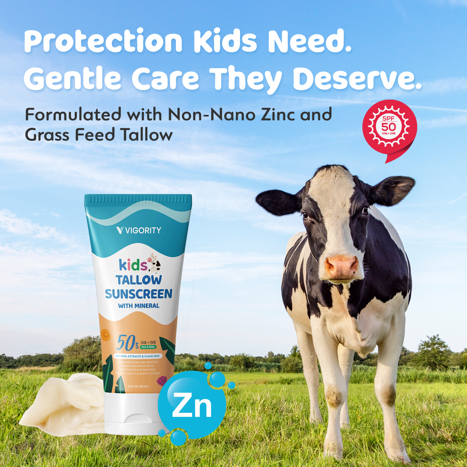 Beef Tallow Sunscreen for Kids with Zinc Oxide: Natural Non-Toxic SPF 50 Tallow Sunblock Cream - with Food-Grade Botanical Extracts - Kids & Sensitive Skin Safe, Water-Resistant - 3.4 FL OZ