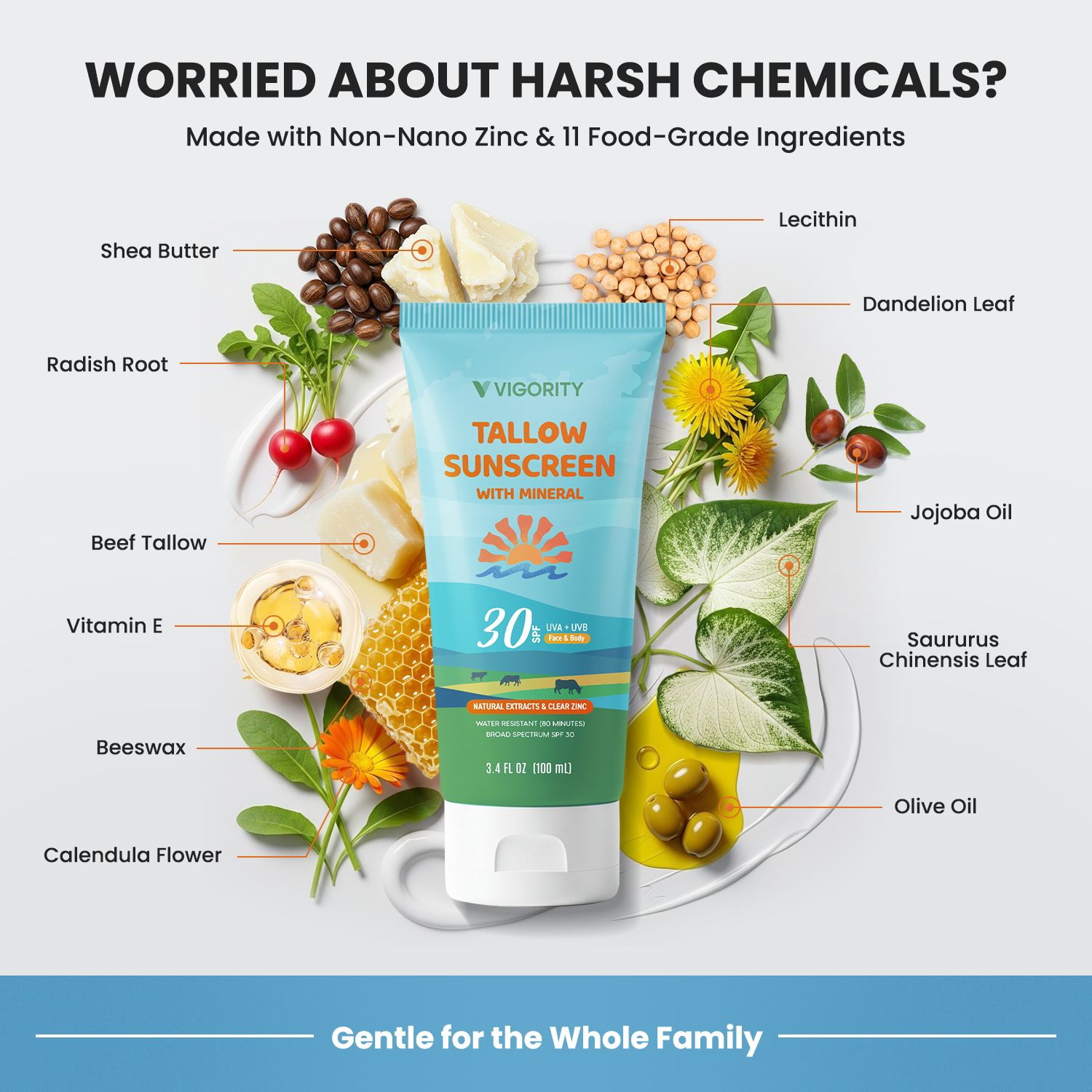 - Natural Non Toxic Sunscreen with Tallow & Zinc: Formulated with Non-Nano Zinc Oxide and nutrient-rich Beef Tallow, this SPF 30 mineral sunscreen provides Broad-Spectrum UVA/UVB protection without harsh chemicals or irritants.
